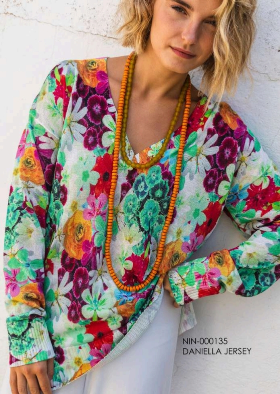 Este jersey presenta un estampado floral exuberante y colorido, que lo convierte en una prenda protagonista.