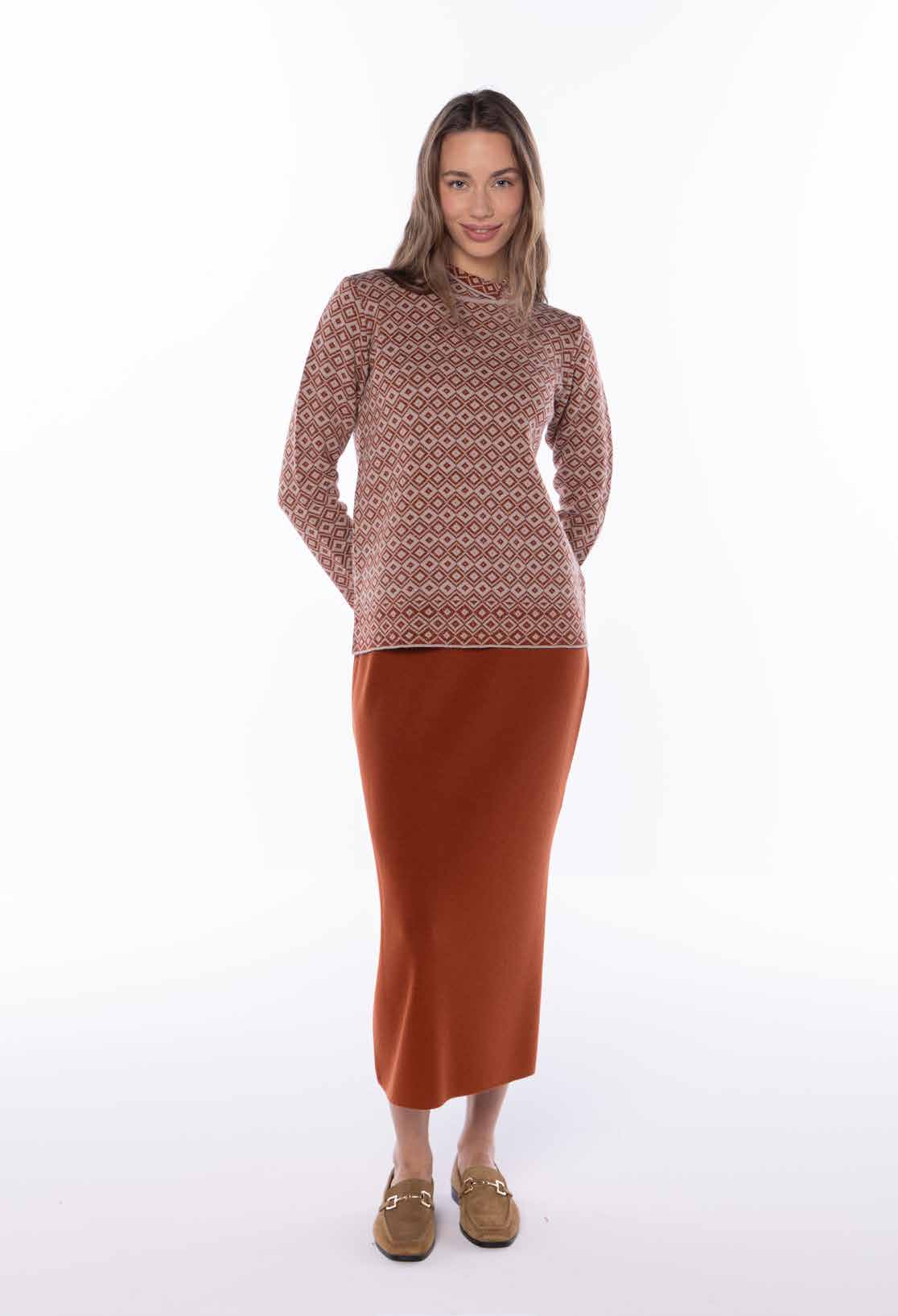 Un jersey de manga larga y corte recto, confeccionado con tejido de punto que presenta un diseño geométrico en rombos. Su ajuste es cómodo, ideal para un estilo casual con un toque elegante gracias al estampado repetitivo que aporta dinamismo visual.