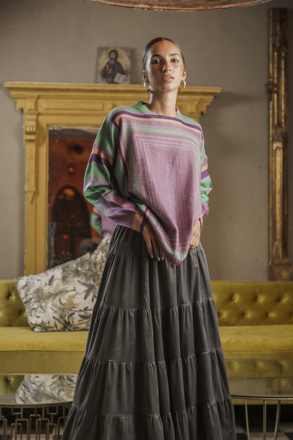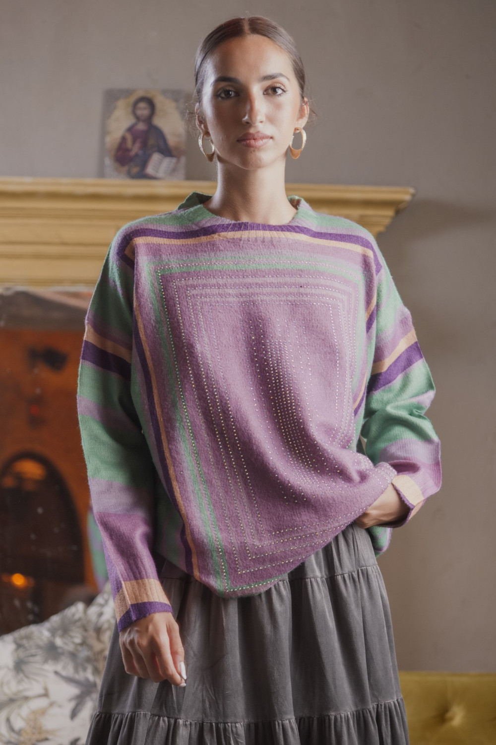 Es un jersey de corte recto y talla única, confeccionado en un tejido suave y cómodo. Su diseño destaca por un estampado geométrico enmarcado al frente, decorado con apliques de strass que aportan brillo y un toque sofisticado. Las mangas largas y el cuello redondo clásico lo convierten en una prenda versátil y fácil de combinar, ideal tanto para un look casual como para dar un aire más elegante a un conjunto sencillo.