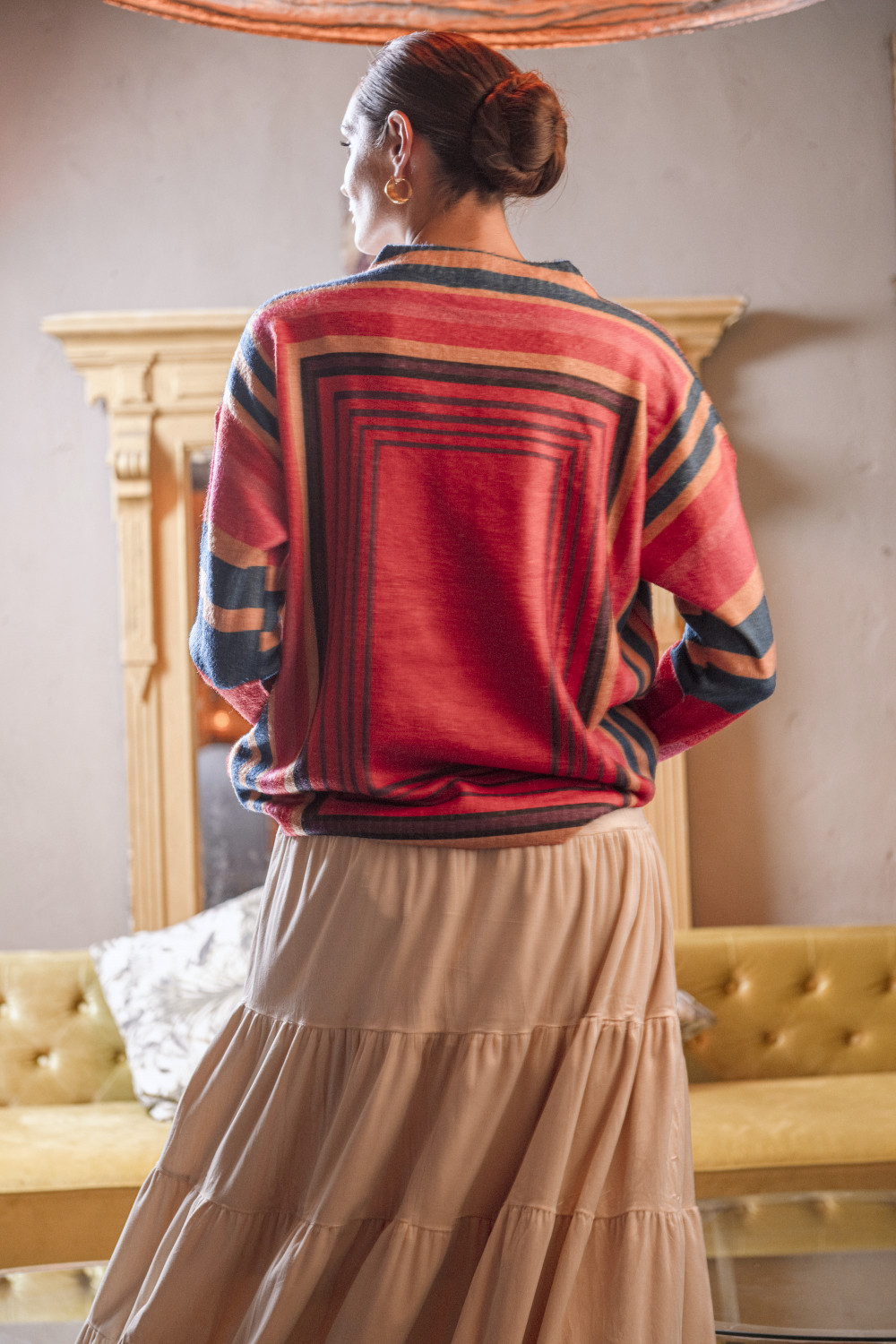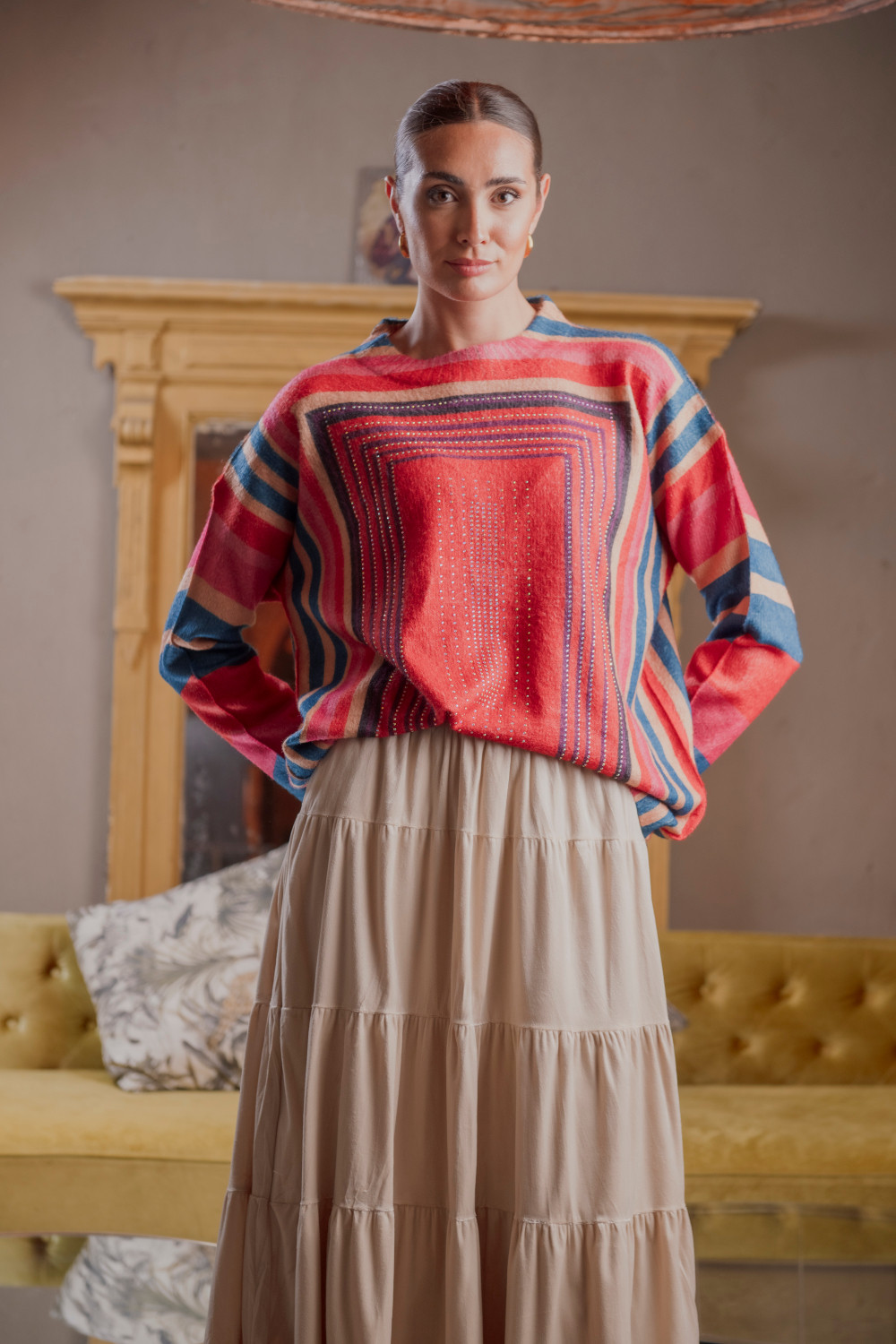 Es un jersey de corte recto y talla única, confeccionado en un tejido suave y cómodo. Su diseño destaca por un estampado geométrico enmarcado al frente, decorado con apliques de strass que aportan brillo y un toque sofisticado. Las mangas largas y el cuello redondo clásico lo convierten en una prenda versátil y fácil de combinar, ideal tanto para un look casual como para dar un aire más elegante a un conjunto sencillo.
