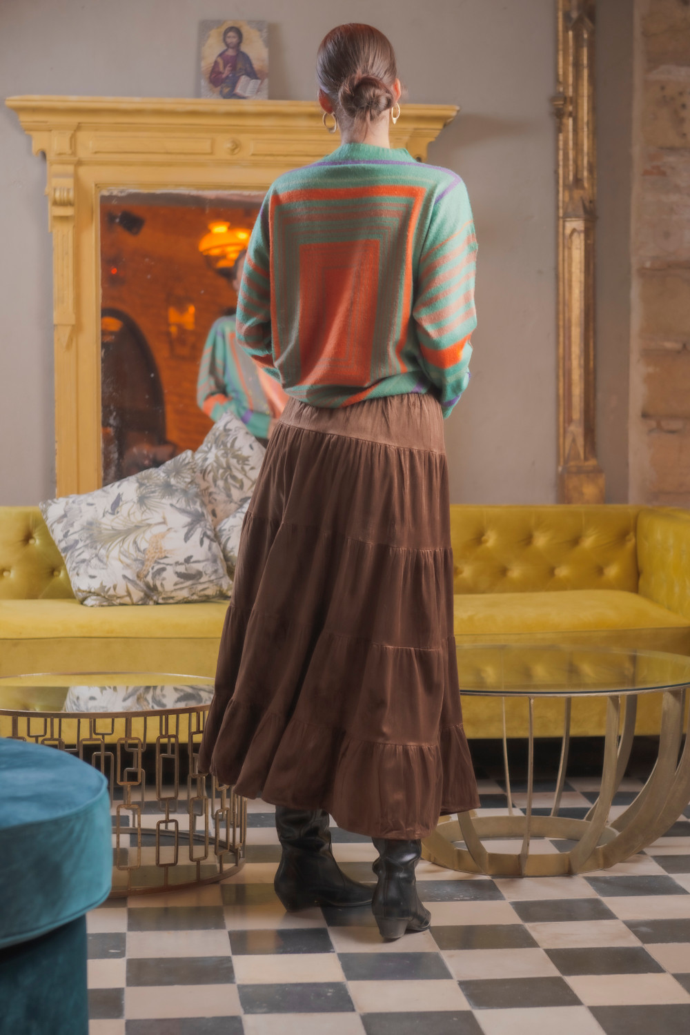 Es un jersey de corte recto y talla única, confeccionado en un tejido suave y cómodo. Su diseño destaca por un estampado geométrico enmarcado al frente, decorado con apliques de strass que aportan brillo y un toque sofisticado. Las mangas largas y el cuello redondo clásico lo convierten en una prenda versátil y fácil de combinar, ideal tanto para un look casual como para dar un aire más elegante a un conjunto sencillo.