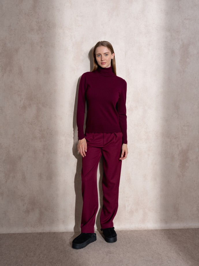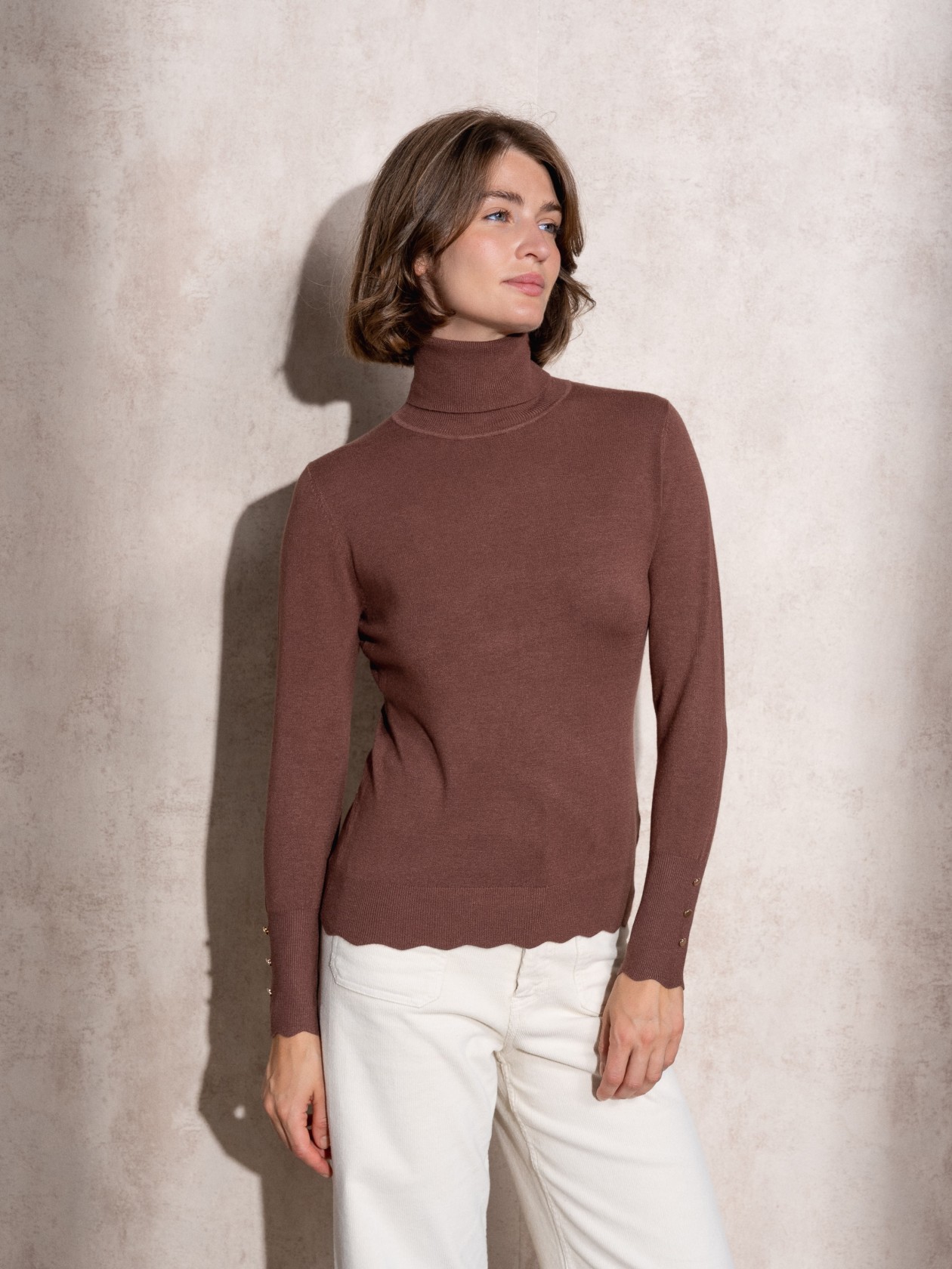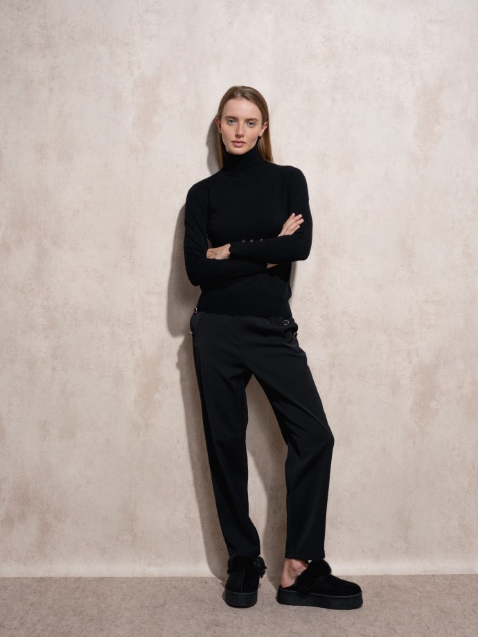 El jersey tiene un diseño de cuello alto tipo cisne y manga larga, confeccionado en un tejido fino y ajustado que se adapta a la silueta con elegancia. Presenta un acabado delicado en el bajo y en los puños con borde ondulado, lo que aporta un detalle femenino y distintivo. Los puños incluyen pequeños botones decorativos que enriquecen la prenda con un toque sutil de sofisticación. Es una pieza versátil que puede usarse tanto de manera casual como en looks más arreglados.
