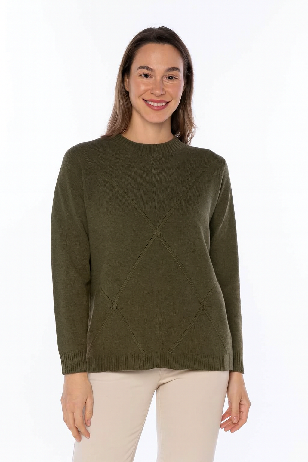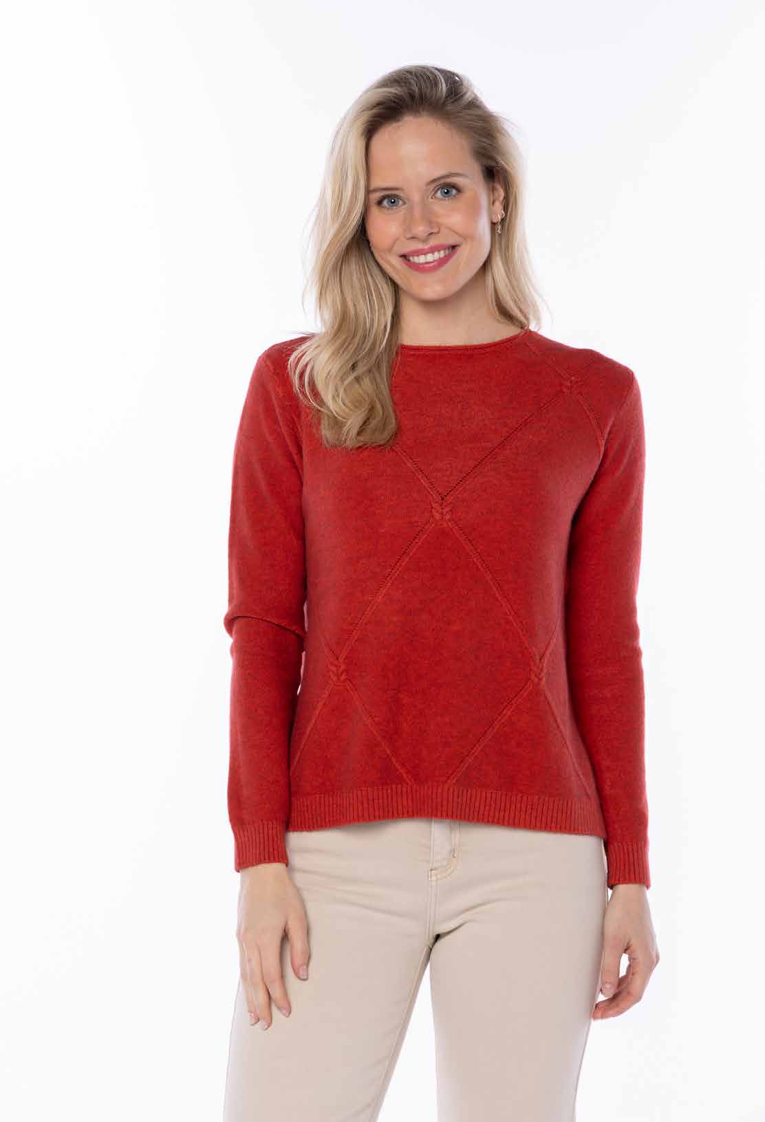Este jersey presenta un diseño elegante de punto fino con detalles geométricos en la parte frontal, que aportan textura y originalidad. Tiene cuello redondo clásico, manga larga y terminaciones acanaladas en los puños y el bajo, que le dan estructura y comodidad. Es una prenda versátil que combina a la perfección con looks casuales o más arreglados, convirtiéndose en un básico con un toque distintivo.