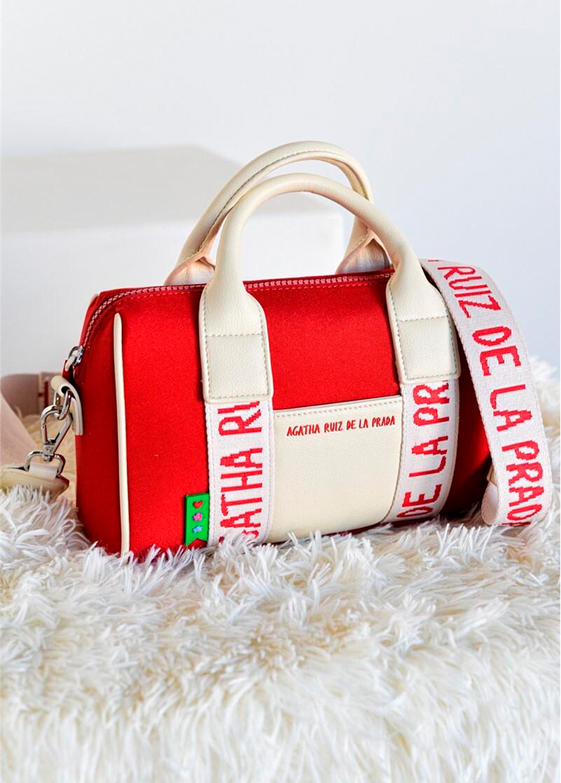 Bolso estilo mini bowling diseñado en lona con asas y correa larga con logo de Agatha Ruiz de la Prada grabado en el color del modelo.