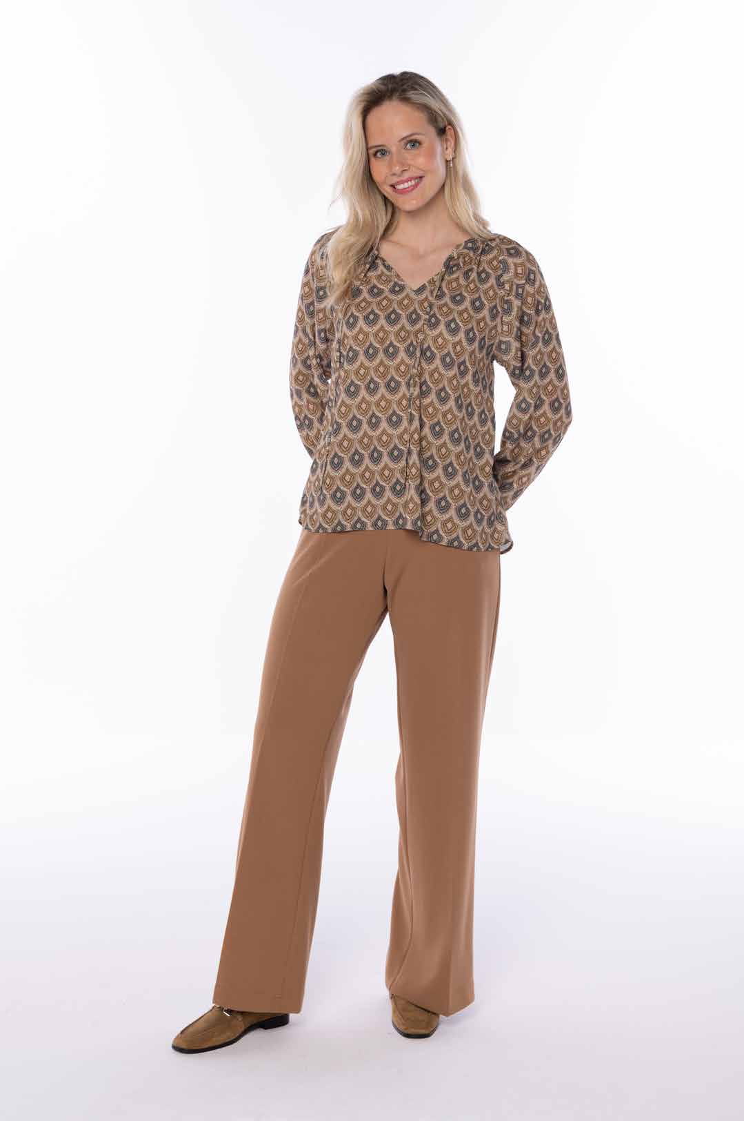 Este pantalón tiene un corte recto y fluido, ligeramente ancho en la caída, lo que aporta comodidad y un aire elegante. La cintura es de talle medio y no lleva pinzas, ofreciendo una silueta limpia y estilizada. Es una prenda versátil que combina fácilmente tanto en looks formales con blusas o chaquetas, como en estilismos más casuales con camisetas o jerséis.