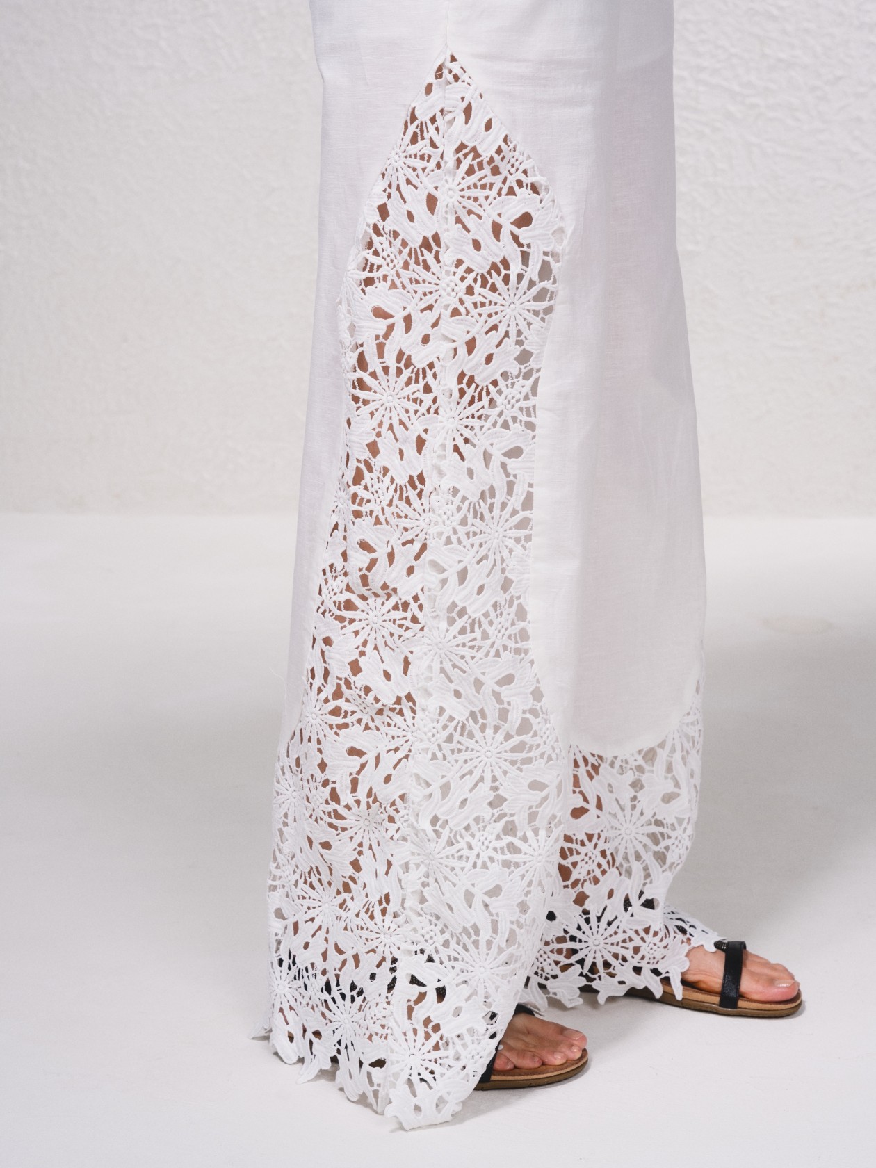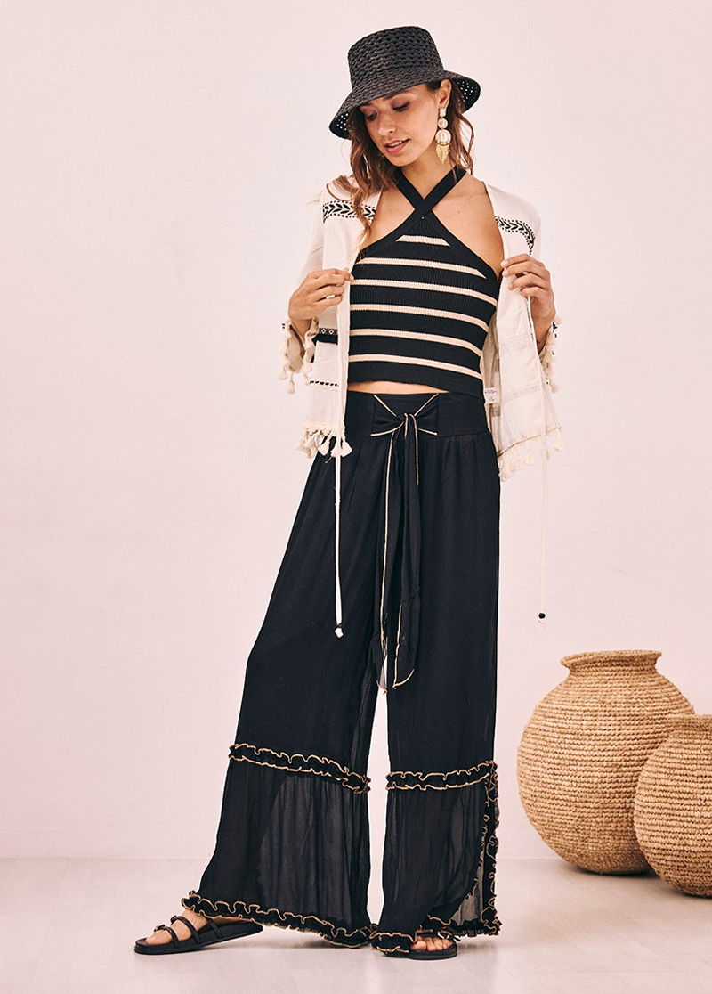 Pantalón largo con abertura en los laterales. Detalle de anudado en la parte frontal y goma fruncida en la parte trasera. Bajo y cinturón con detalles dorados.