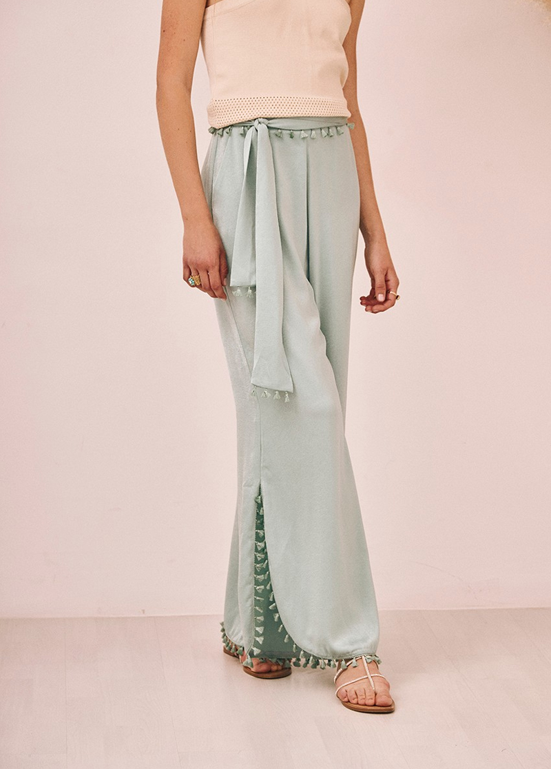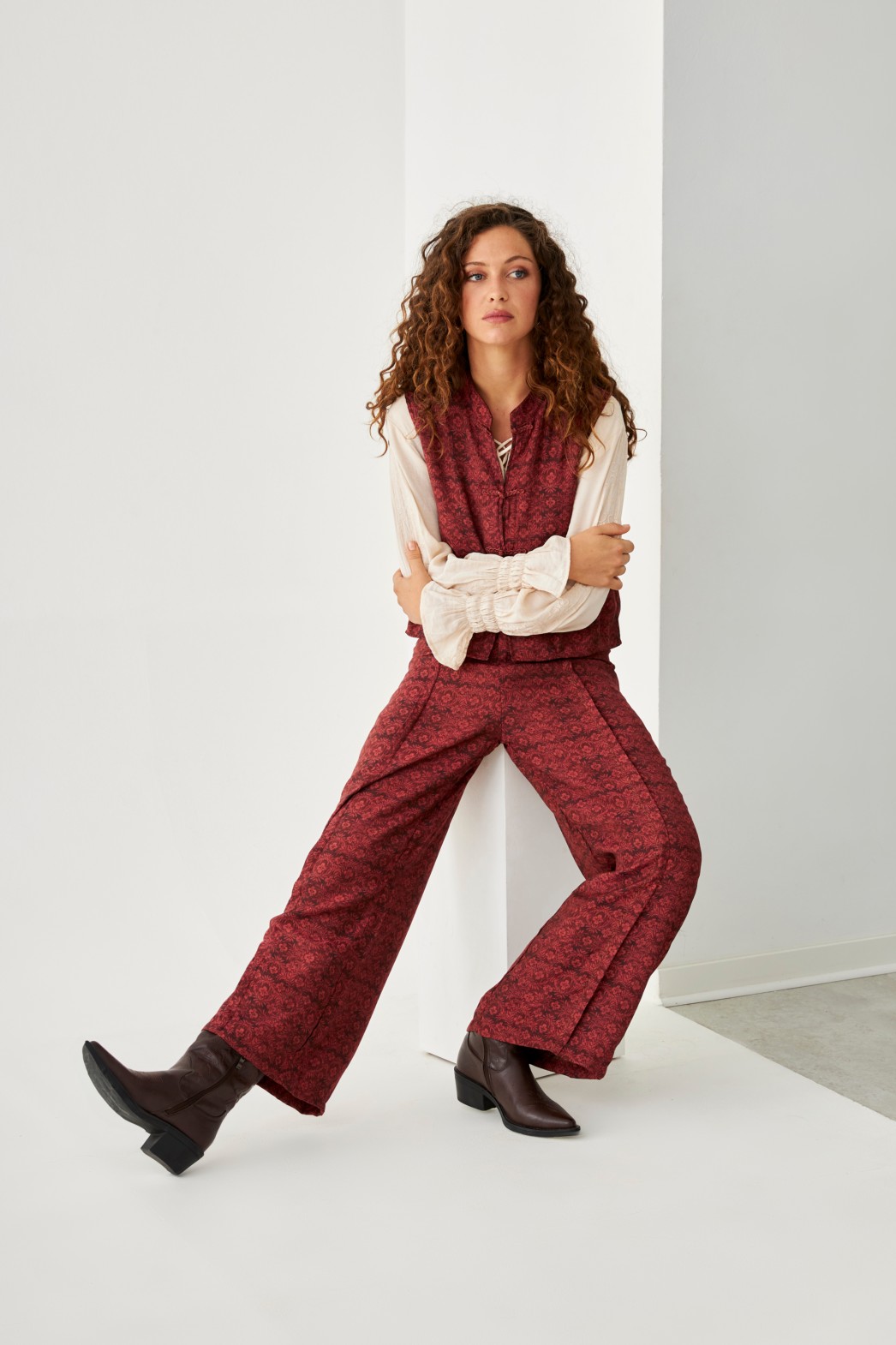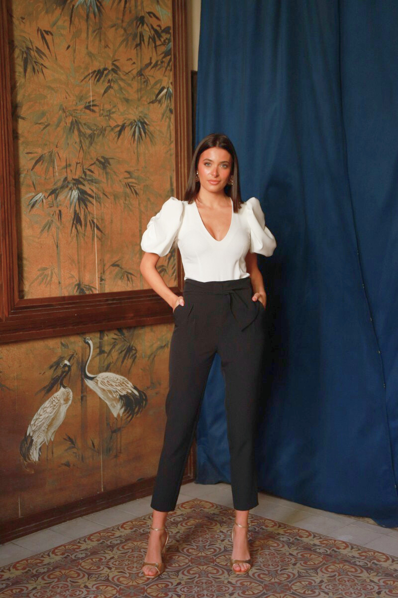 Corte: Tiro alto, lo que estiliza la figura y acentúa la cintura.
