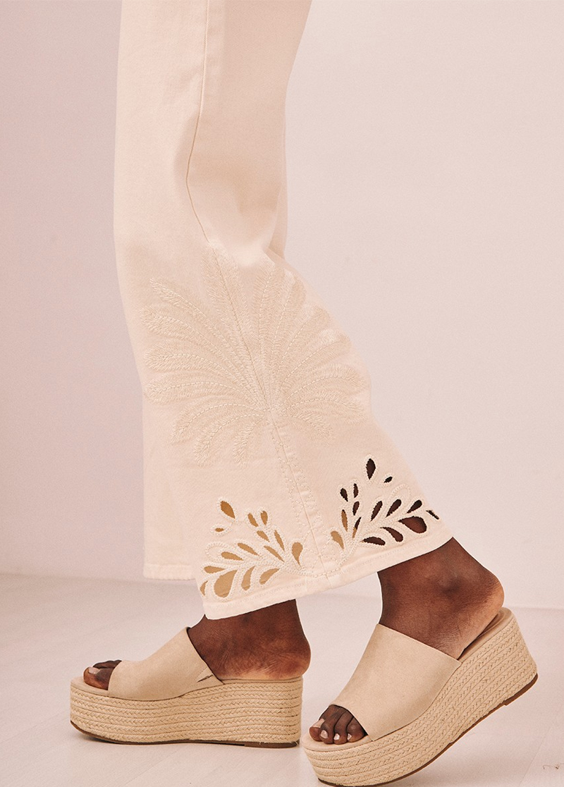 Pantalón largo cargo estampado. Detalles cinta bordada en cintura y bolsillo. Abertura con goma trasera.