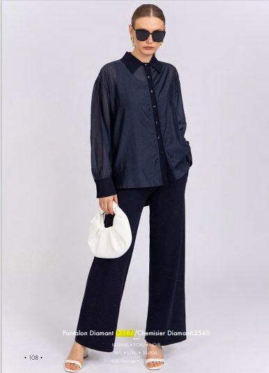 Este pantalón destaca por su diseño elegante y sofisticado. Está confeccionado en un tejido fluido con una sutil textura brillante distribuida por toda la prenda, lo que le da un toque de glamour sin ser excesivo. Su corte es recto y amplio, proporcionando una caída ligera y cómoda que estiliza la silueta. El color marino profundo refuerza su versatilidad, permitiendo combinarlo fácilmente con otras prendas. Es una opción ideal para quienes buscan un look refinado y moderno, perfecto para eventos tanto formales como semiformales.