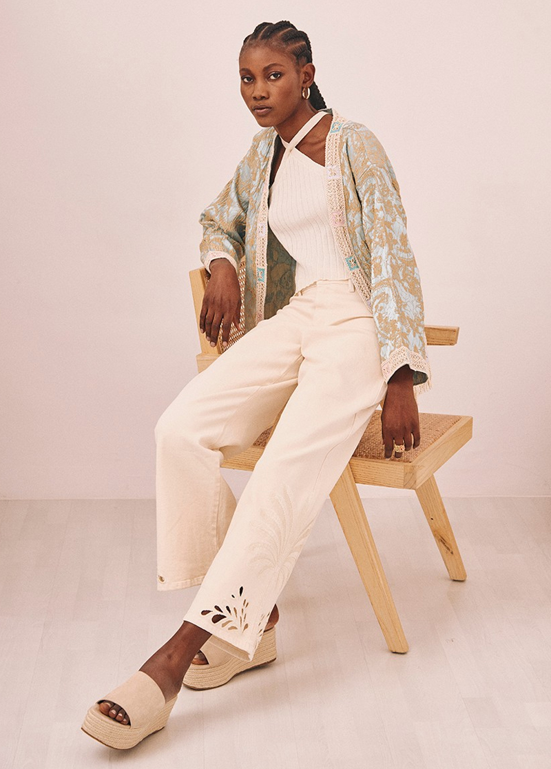 Pantalón denim largo ancho liso. Cierre con bragueta. Detalles bordados con pedrería y calados en el lateral.