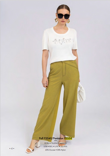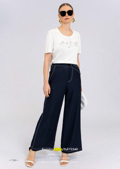 Los pantalones son de corte amplio y fluido, proporcionando un look elegante y cómodo.