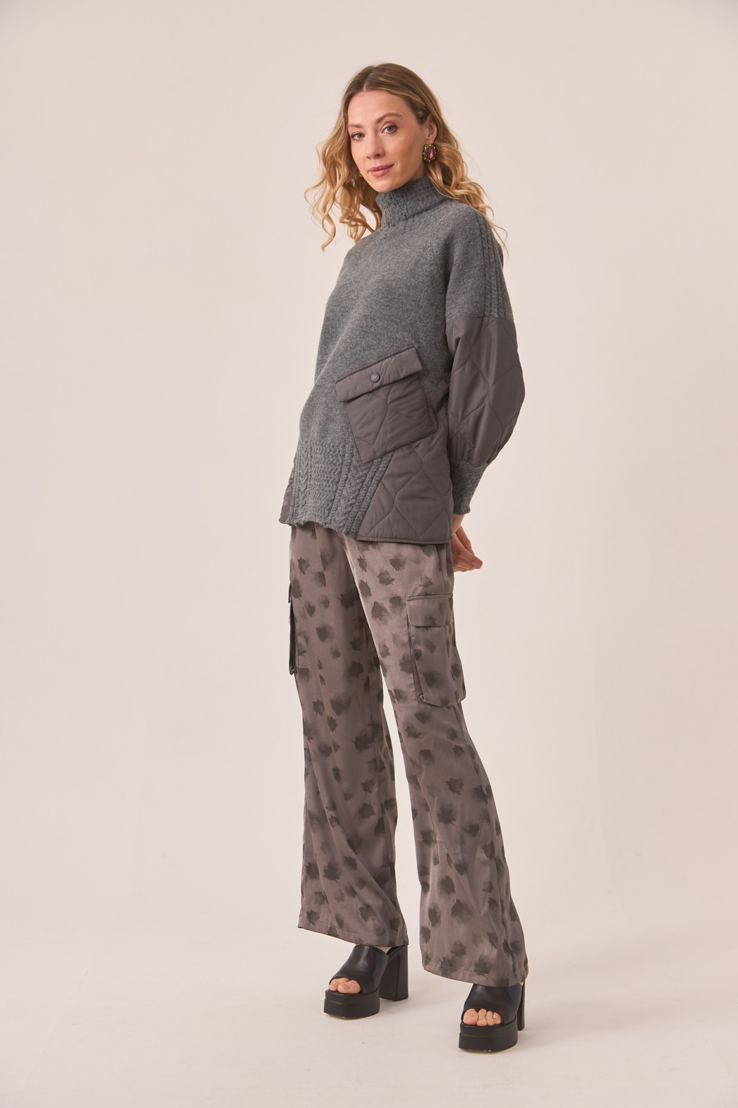 Las imágenes muestran un look moderno centrado en unos pantalones cargo grises con un estampado de hojas. Los pantalones tienen un corte relajado de pierna ancha con bolsillos laterales, lo que les da un toque utilitario y contemporáneo. El tejido parece suave y cae de manera fluida, brindando un estilo sofisticado pero casual. En la segunda imagen, los pantalones se combinan con un suéter de corte oversize, que presenta una mezcla de tejidos tejidos y acolchados, creando un efecto texturizado y de capas. La modelo completa el look con zapatos de plataforma, lo que eleva aún más el estilo. Finalmente, la tercera imagen hace un acercamiento a los detalles de los pantalones, mostrando el cordón de la cintura y los bolsillos laterales, resaltando tanto la comodidad como el estilo.