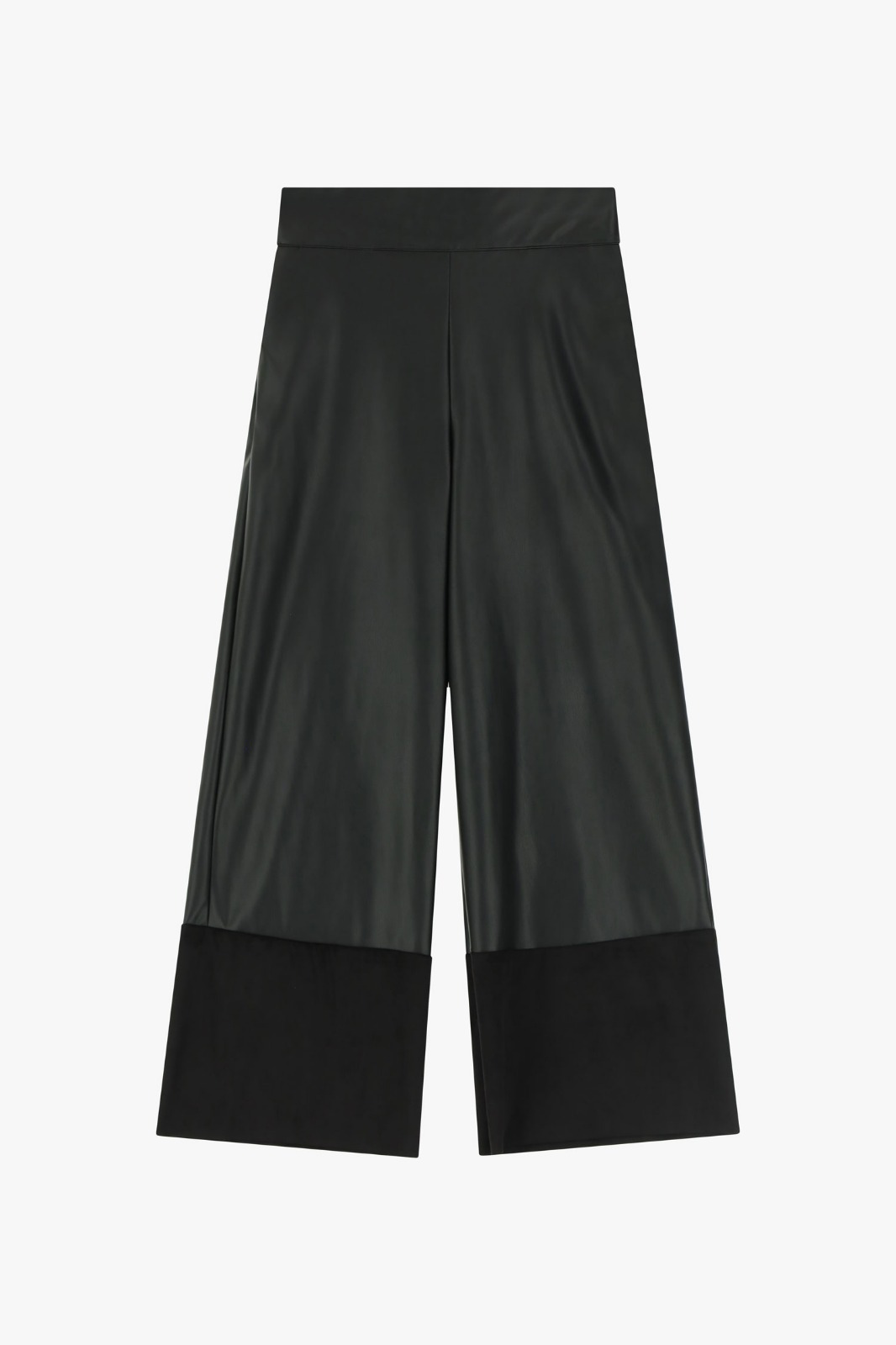 Un pantalón de corte ancho con un diseño moderno y minimalista que combina texturas. La parte superior está confeccionada en un material de acabado satinado que le aporta un aspecto elegante y fluido, mientras que en la parte baja de cada pierna se incorpora un bloque de tela mate en tono oscuro, creando un contraste sutil pero llamativo. Su silueta recta y amplia ofrece comodidad y movimiento, convirtiéndolo en una prenda versátil que puede adaptarse tanto a un estilo sofisticado como a uno más relajado y contemporáneo.