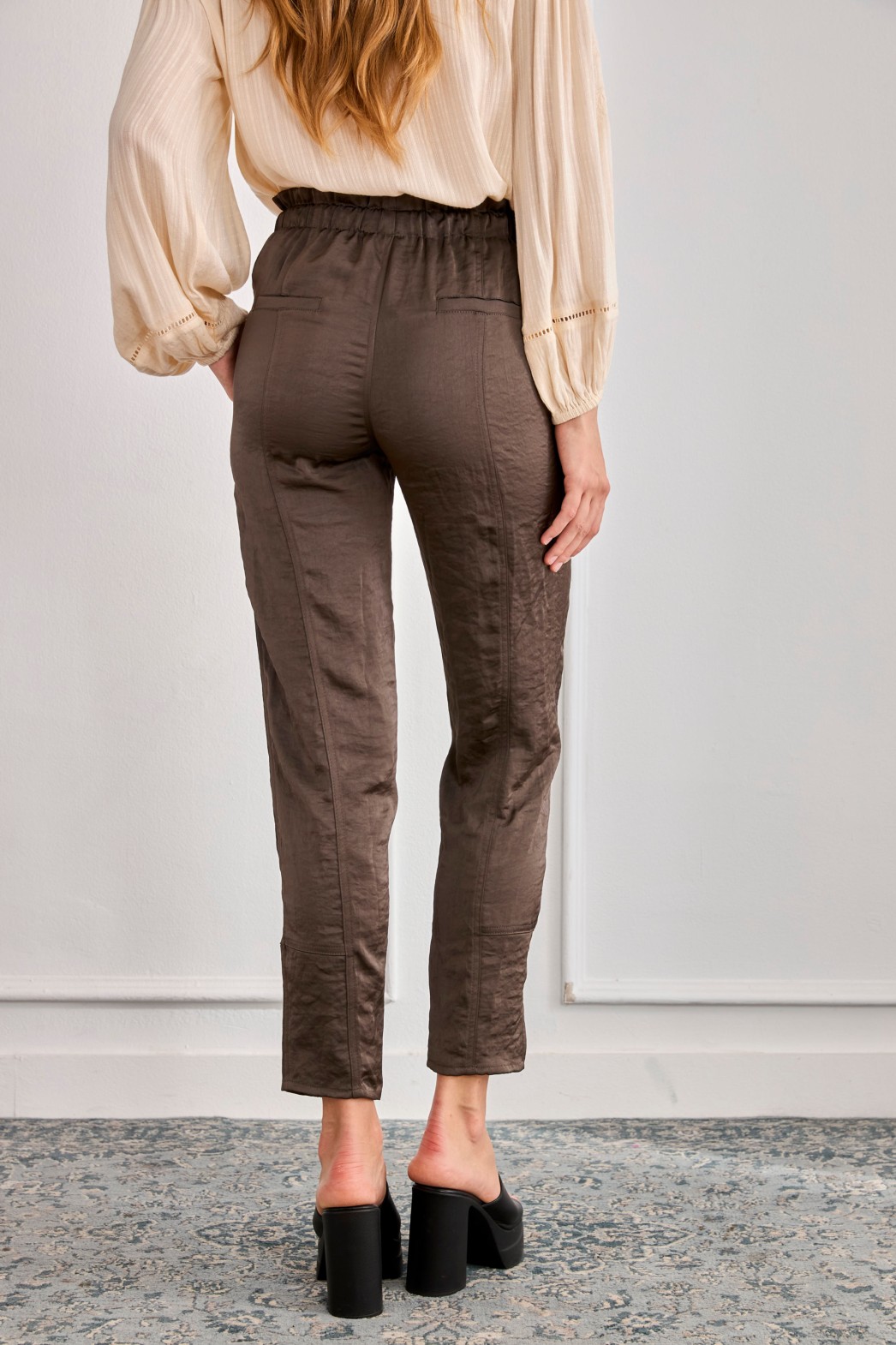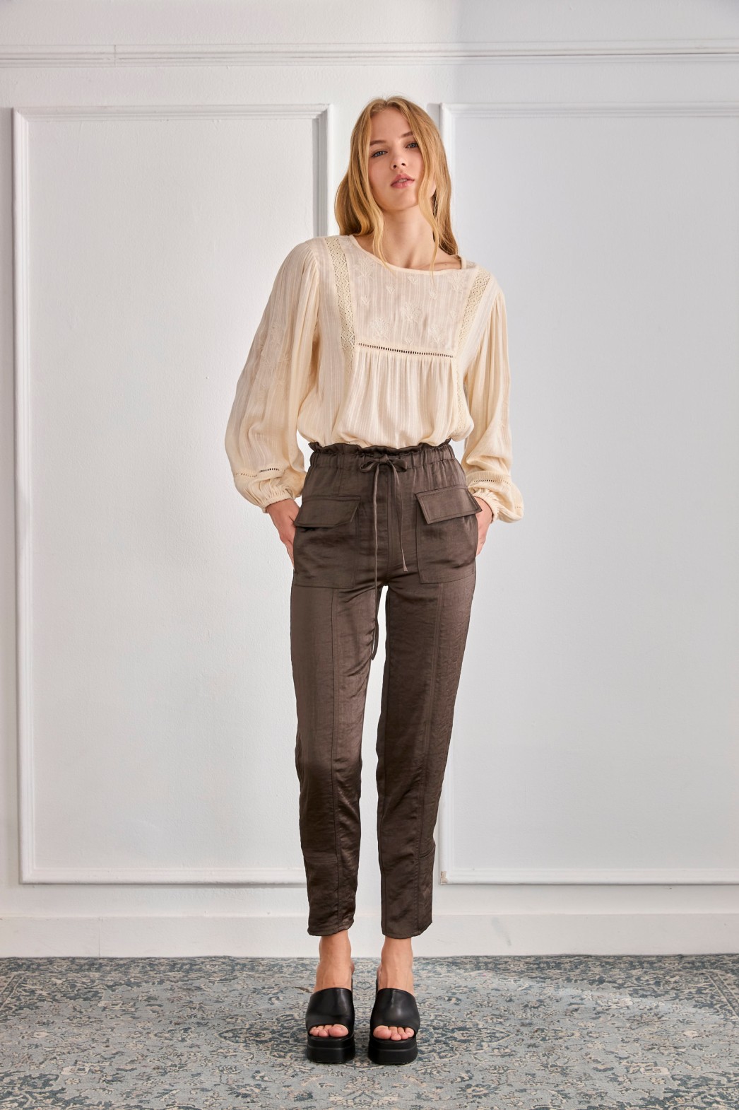 Pantalón cargo en tejido satinado, con bolsillos delanteros y bajos estrechos. Cintura con cordón para anudar ajustable.