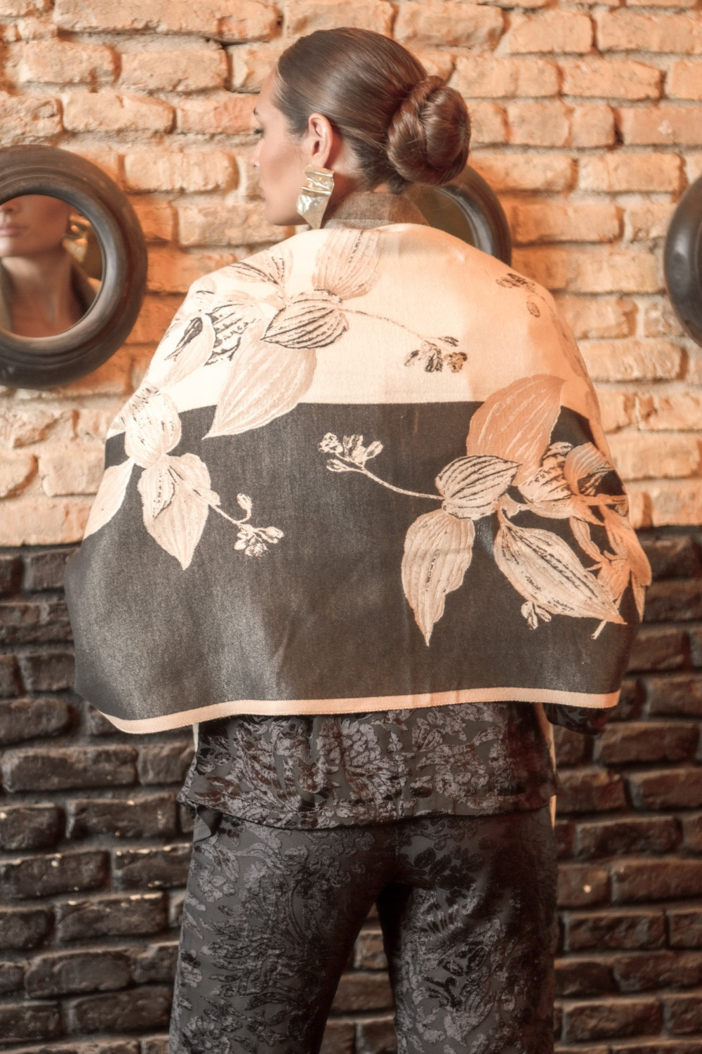 La prenda es una pashmina de diseño artístico, con un tejido suave y ligero que se adapta cómodamente al cuerpo. Presenta un patrón elegante con motivos florales y detalles decorativos que le otorgan un estilo sofisticado y versátil. Su confección permite llevarla de diferentes maneras, ya sea sobre los hombros o como accesorio envolvente. Es de talla única, ideal para complementar cualquier atuendo con un toque distintivo y refinado.