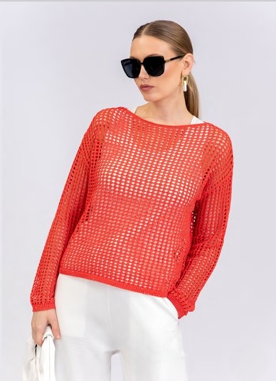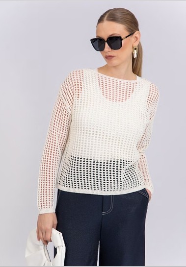 Diseño calado tipo red, que permite la combinación con prendas inferiores o tops interiores para un look versátil.