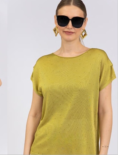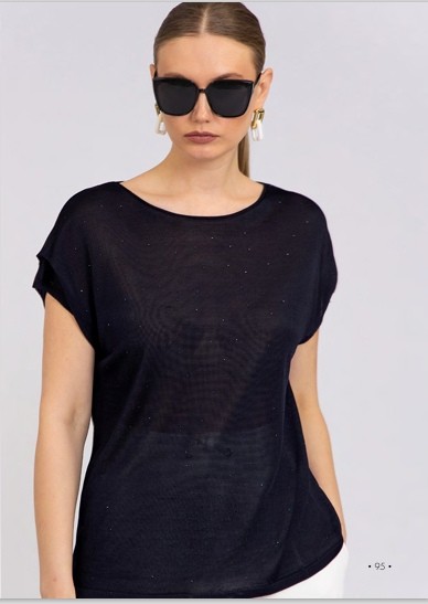 Prenda de corte holgado y diseño minimalista con detalles brillantes sutiles que aportan un toque de sofisticación. Se trata de un suéter ligero con manga corta caída.