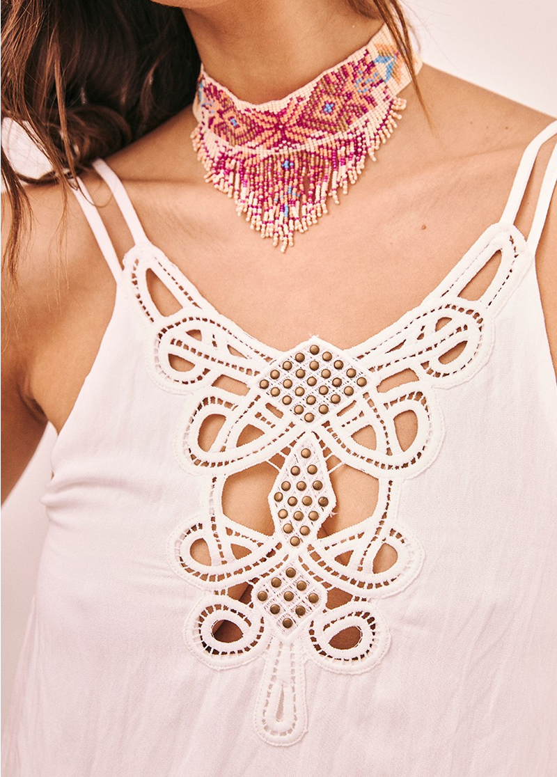 Top liso de tirantes con volantes plisados y escote en pico. Cierre cruzado en el centro con botones. Bajo con volante.