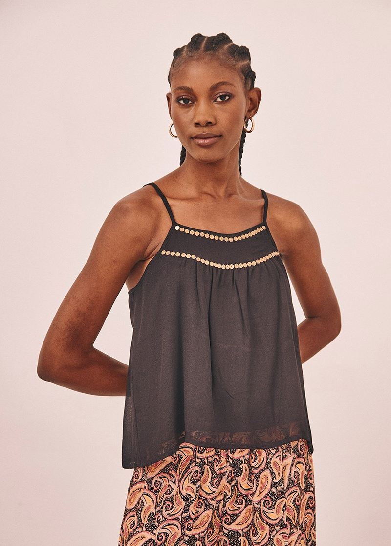 Top corto hasta la cadera de tirantes. Escote en barco con detalles bordados en el escote.