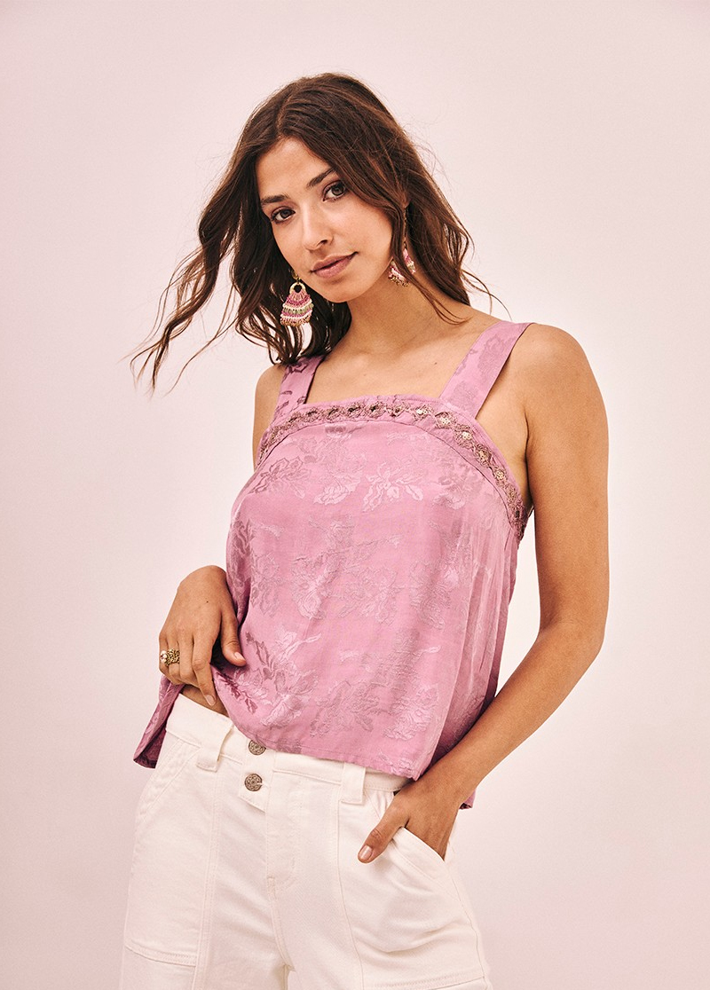 Top estampado jaquard de tirantes largo hasta la cadera. Detalles bordados en escote. Abertura en goma trasera con lágrima.