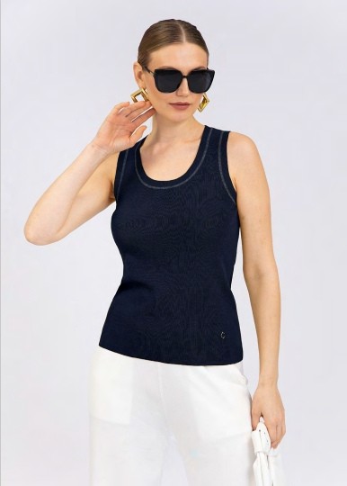 Este top sin mangas es una prenda básica pero sofisticada, ideal para looks elegantes y versátiles. En color marino, su diseño ajustado resalta la silueta de manera sutil, mientras que el tejido de punto con un ligero relieve aporta textura y un acabado refinado.