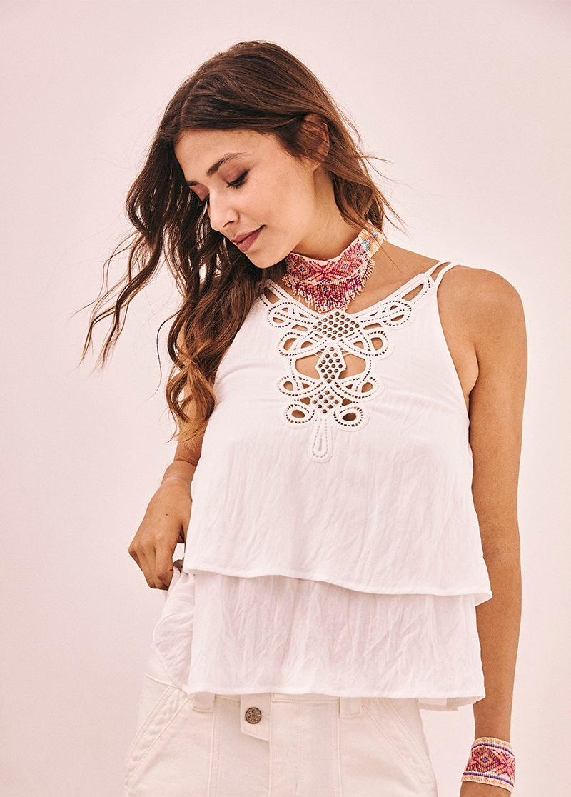 Top de tirantes dobles largo hasta la cadera. Escote con calados y pedrería metálica. Acabado en capa doble en el bajo.