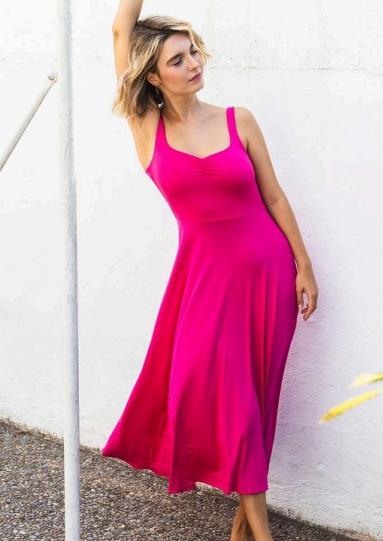 Diseño: Corte midi con silueta fluida que se adapta suavemente al cuerpo, acentuando la figura sin ajustar demasiado. Cuenta con tirantes anchos y un escote sutilmente fruncido que aporta un detalle delicado al busto.