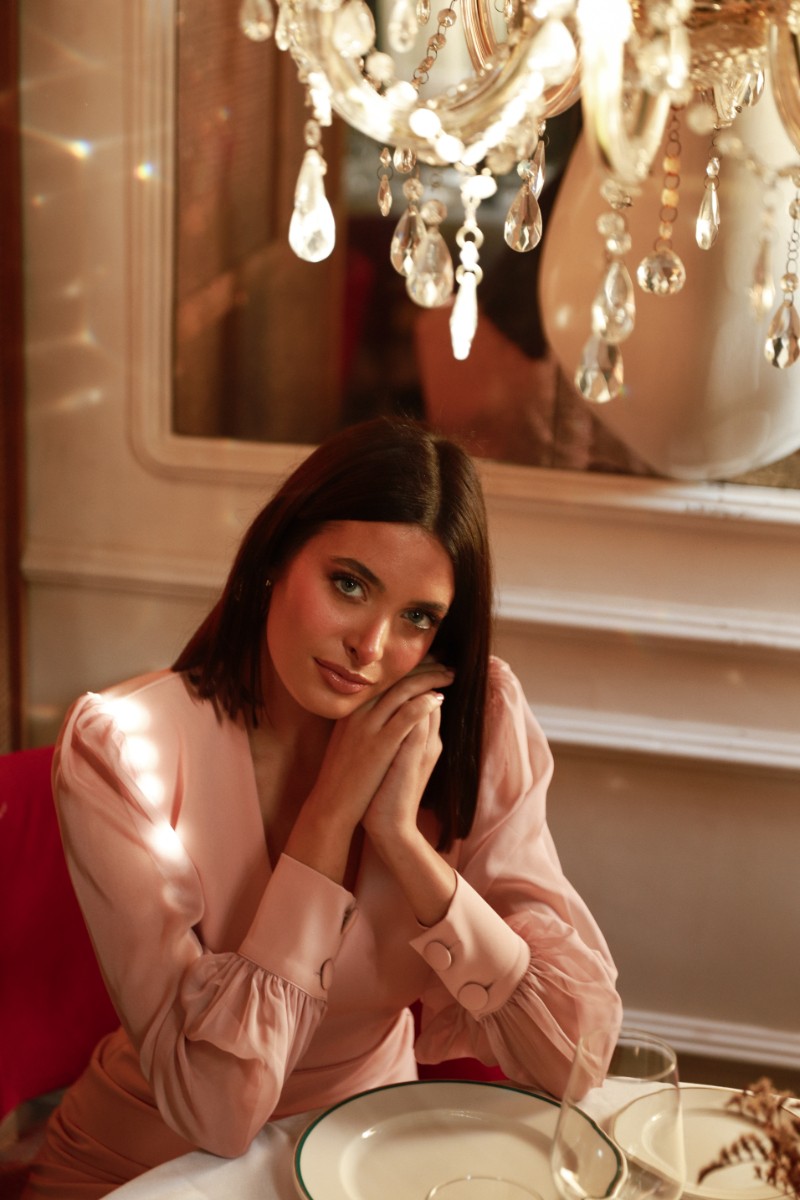 Vestido perfecto para invitada a comunión. Confeccionado en tejido bioelástico combinado con gasa. Detalle de botones forrados en puño y vivo de raso en cintura. Cremallera invisible en espalda.