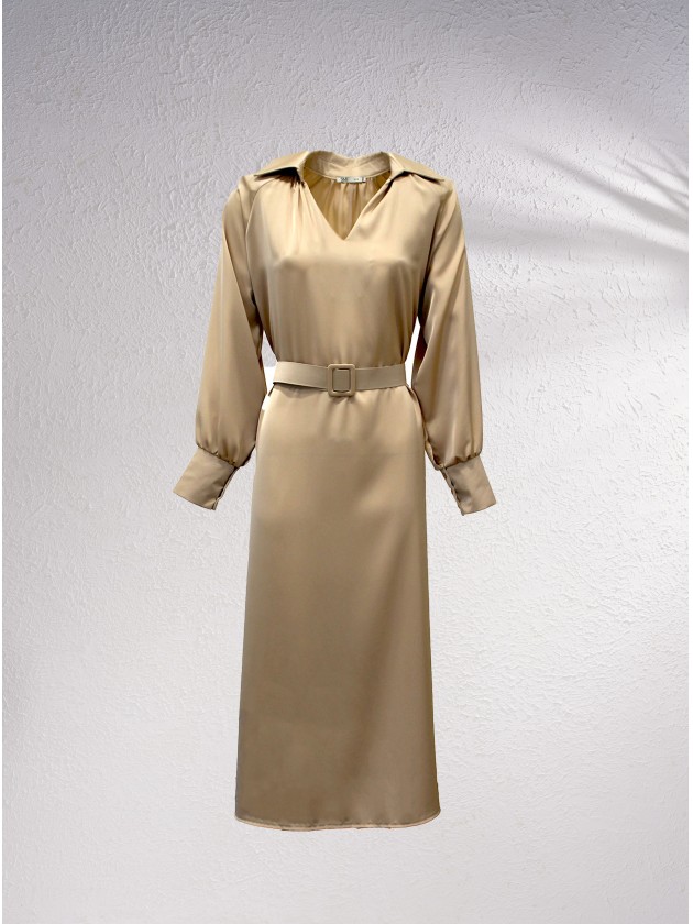 Diseño: Corte recto con largo midi y cinturón a juego que define la cintura. Presenta un escote en «V» con cuello tipo camisa, aportando un aire clásico y pulido.