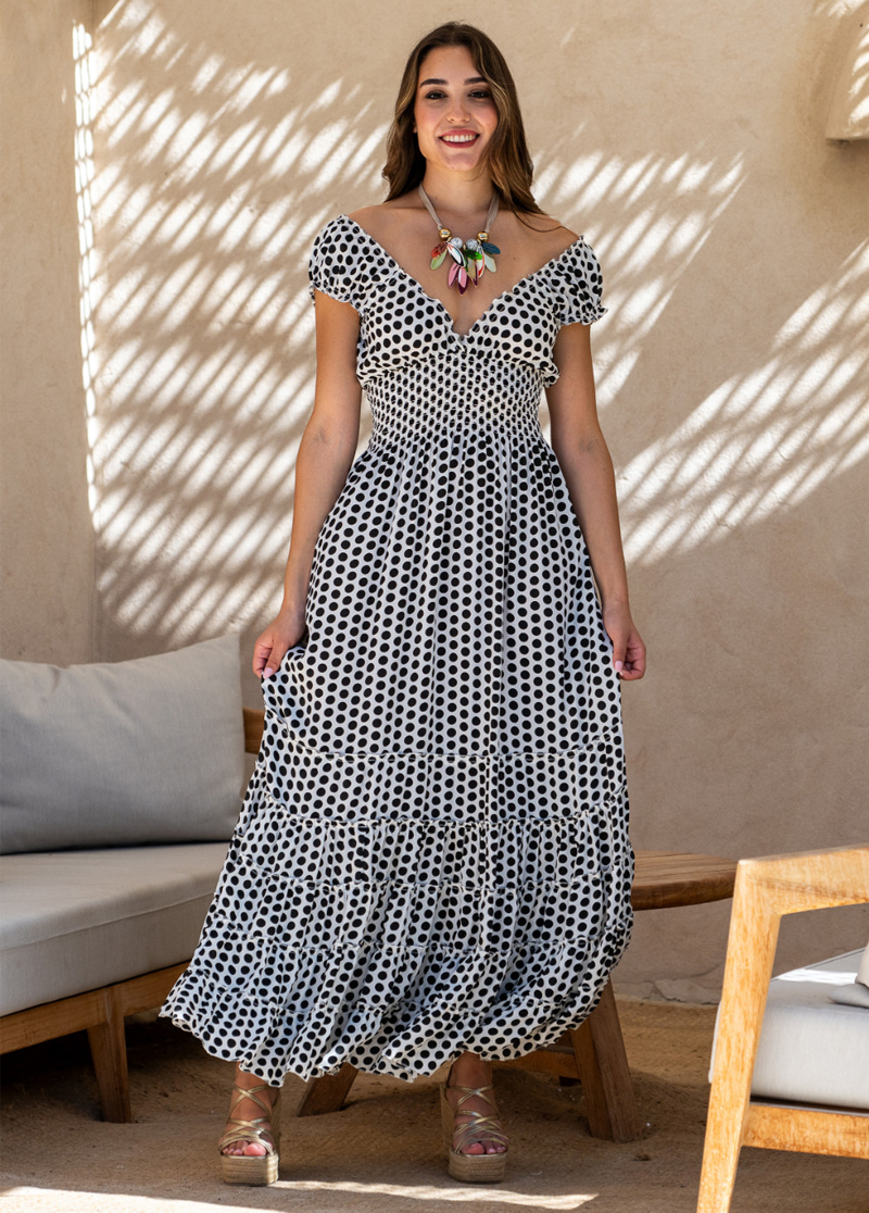Vestido maxi con 5 volantes en el bajo y escote y mangas adaptables con elastico. cinturilla de nido de abeja. Tejido en polisilk y estampado de lunares en blanco y negro.