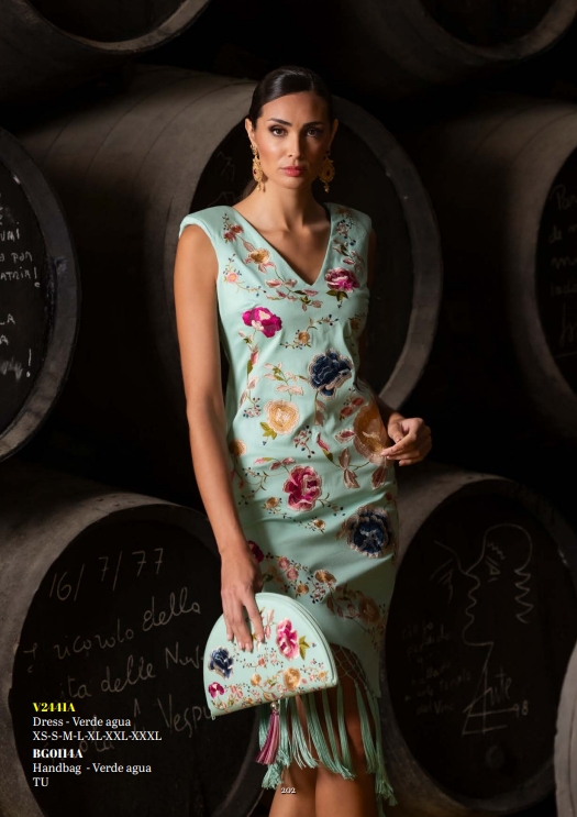 Escote en forma de V, lo que estiliza el cuello y el busto, posee un bordado floral detallado en colores vibrantes como fucsia, azul, dorado y beige, creando un hermoso contraste con el fondo verde agua. La parte inferior del vestido está decorada con flecos largos, aportando movimiento y un toque flamenco.