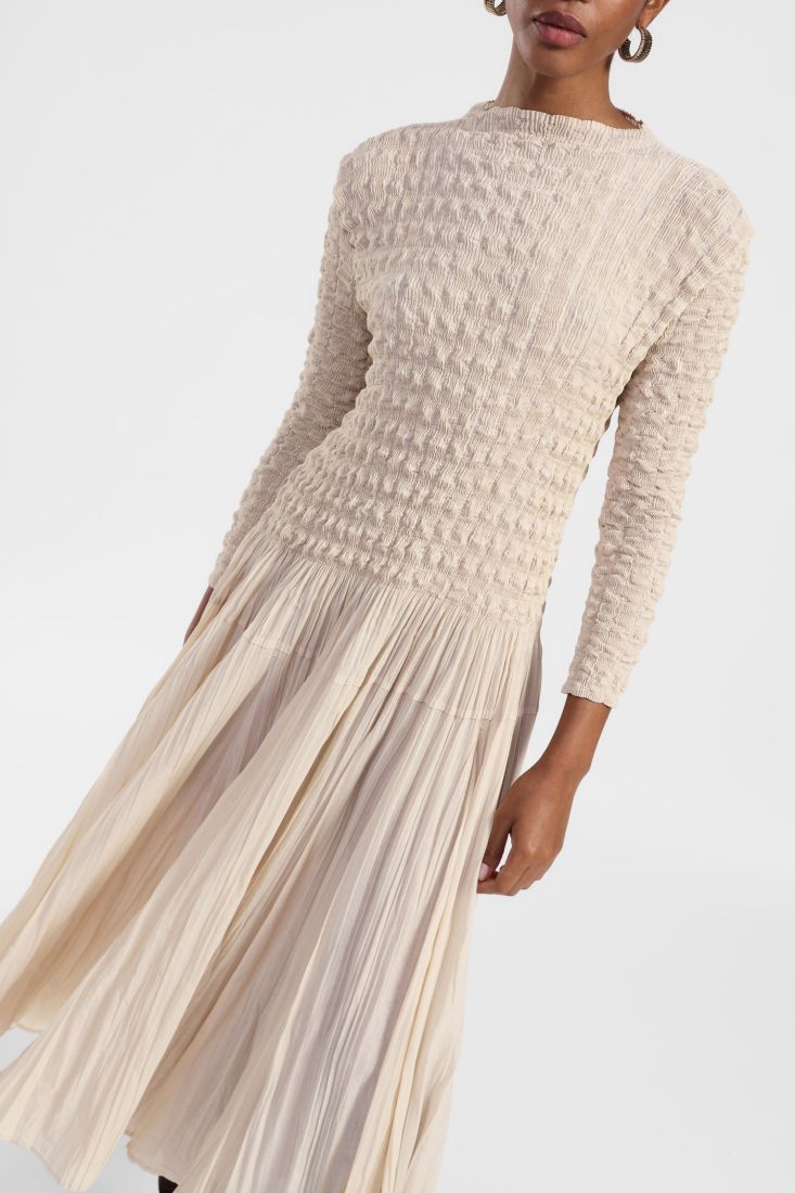 Déjate envolver por la belleza de este vestido a media pierna, perfecto para añadir un toque de elegancia a tu día. Las mangas 3/4 y el escote redondo crean un look sofisticado, mientras que el diseño de color liso lo hace versátil para cualquier ocasión. Imagínatelo con botines o sandalias para un look casual y chic.