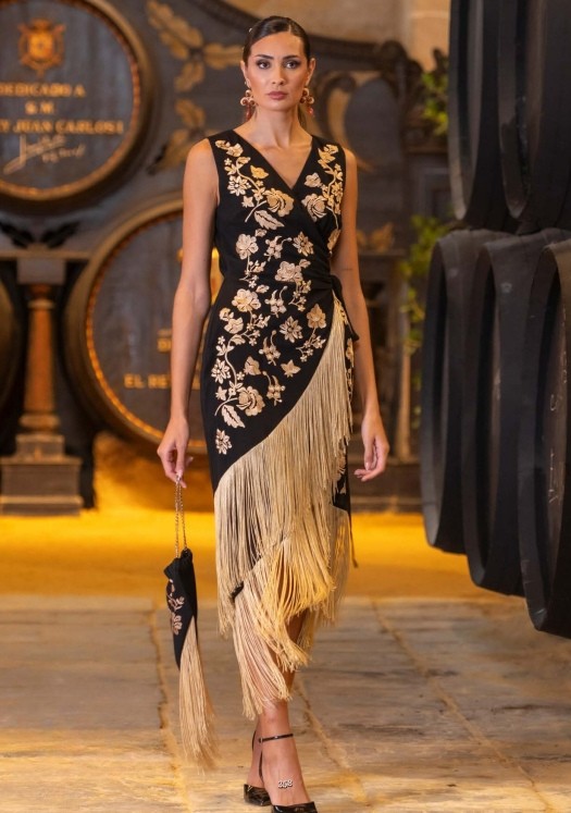 La falda presenta un diseño asimétrico con flecos largos en tono beige, lo que le da un aire flamenco y un movimiento dinámico al caminar. Este vestido es perfecto para eventos formales o celebraciones especiales donde se busca un estilo sofisticado con un toque de tradición.