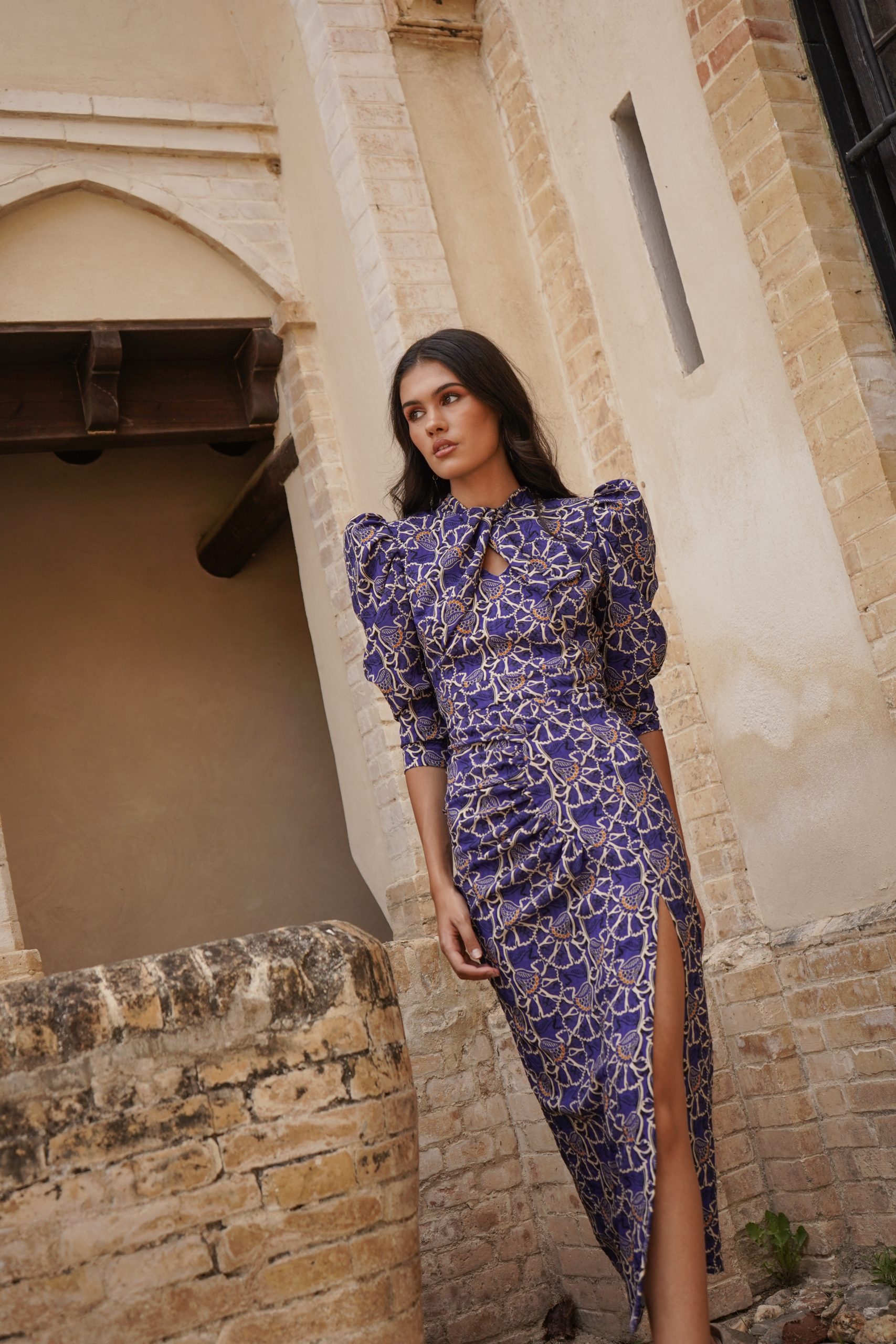Cuerpo efecto dos piezas con mangas globo con detalle de nudo, escote lagrima y falda recta con drapeado lateral. Espalda escote en pico. Confeccionado en un tejido de alta calidad, su diseño único y moderno es perfecto para cualquier ocasión especial. La falda midi con abertura frontal aporta un aire de sofisticación y comodidad. Ideal para eventos formales y celebraciones, este vestido te hará destacar y sentirte única.
