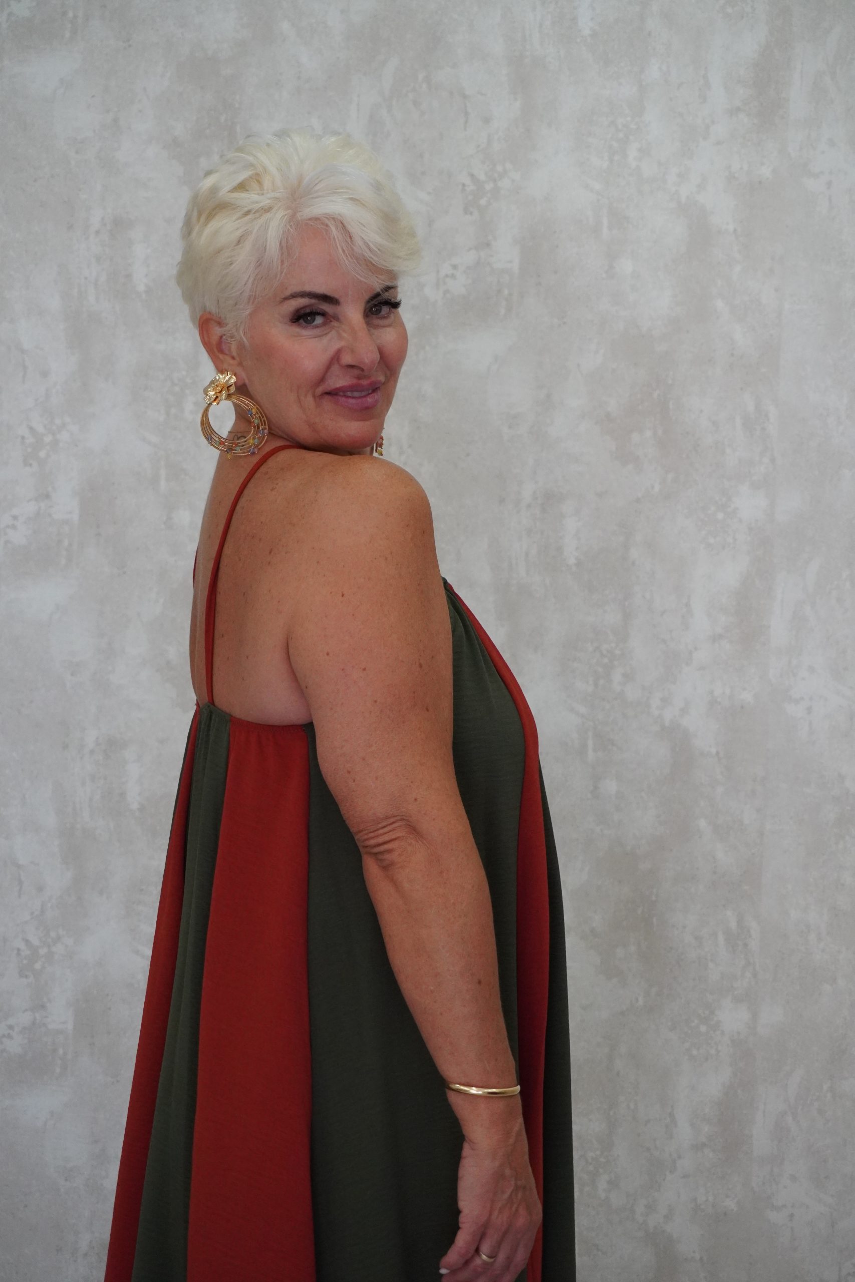 Este vestido largo en tonos verde oliva y caldera destaca por su diseño fluido y moderno, ideal para los días más cálidos. Confeccionado en un tejido ligero y con mucha caída, presenta un original escote halter con tirantes finos que dejan los hombros al descubierto, brindando un toque fresco y femenino. Las franjas verticales en contraste estilizan la silueta y aportan dinamismo al conjunto.